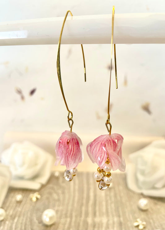 Boucles d'oreilles fleurs de lotus rose pendantes ~
