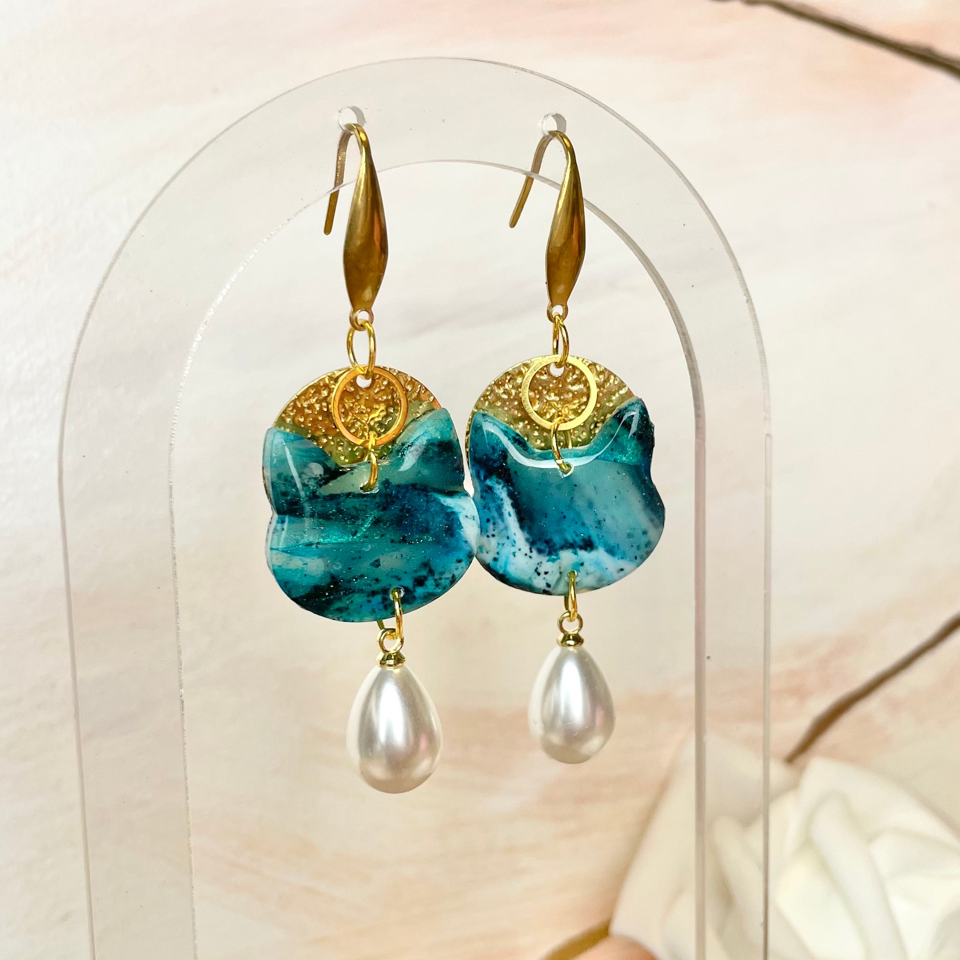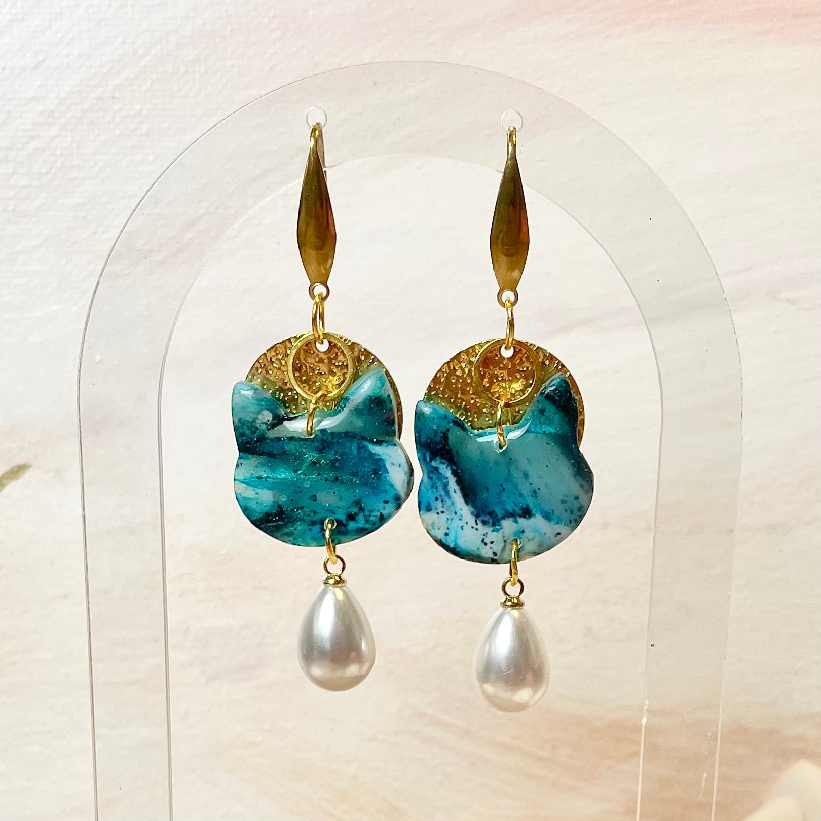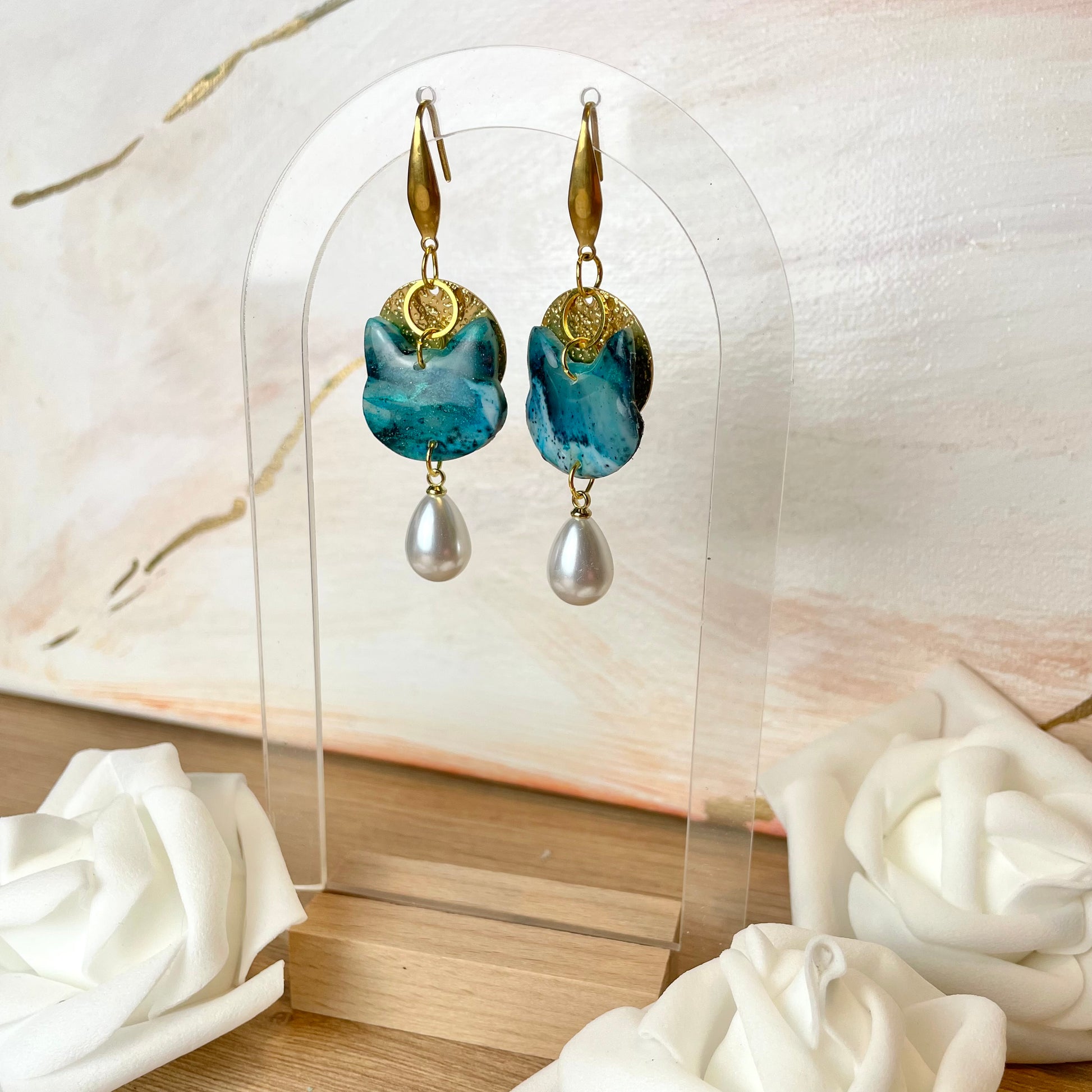 Boucles d’oreilles chat pendantes bleu vert dorées