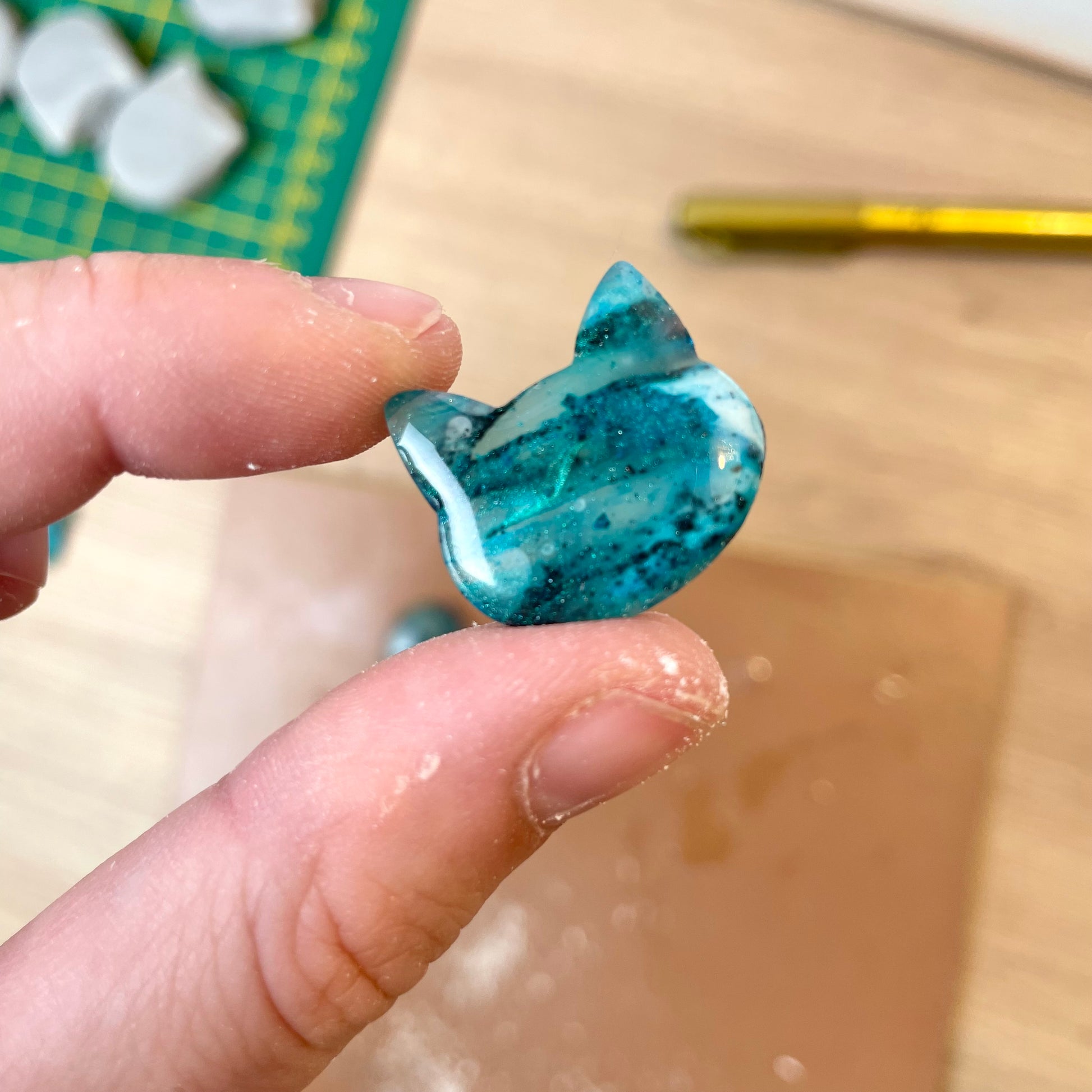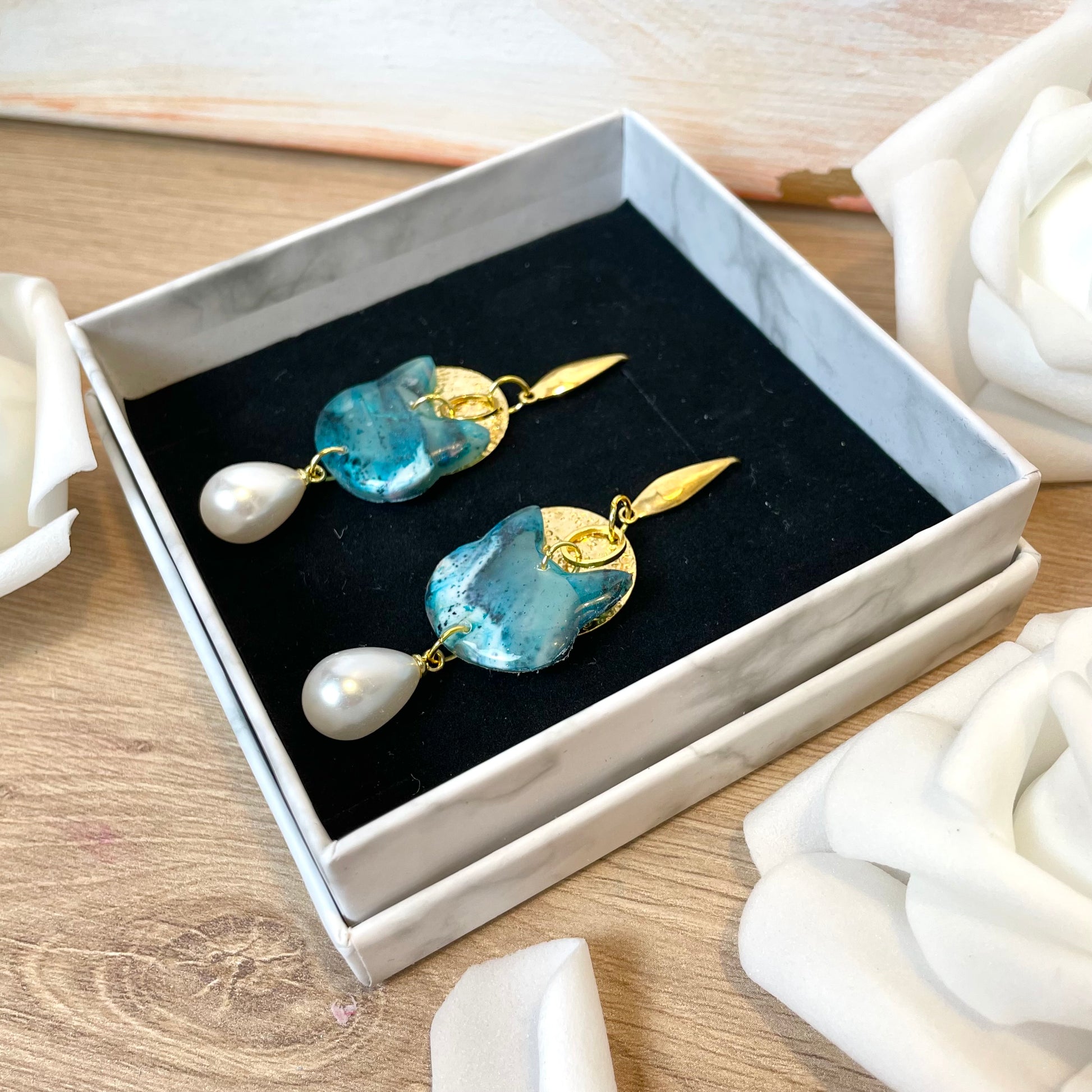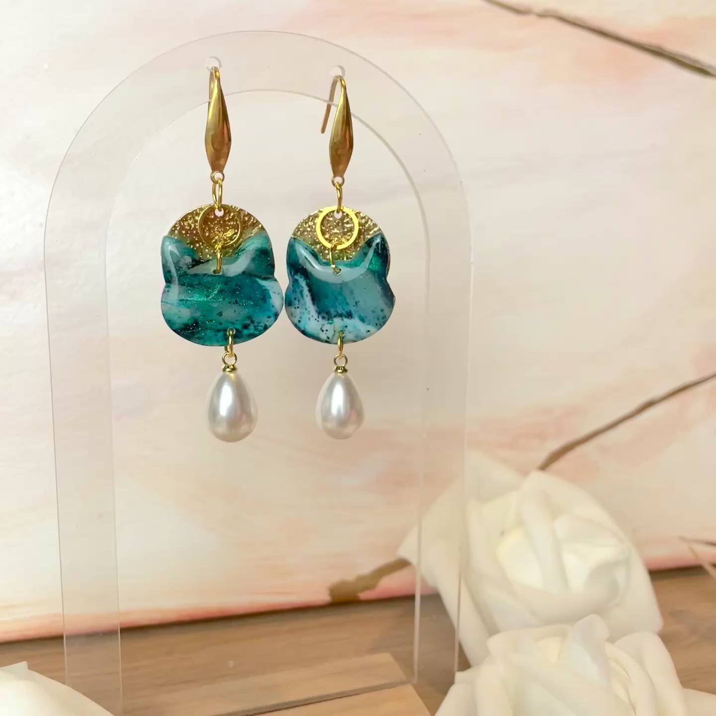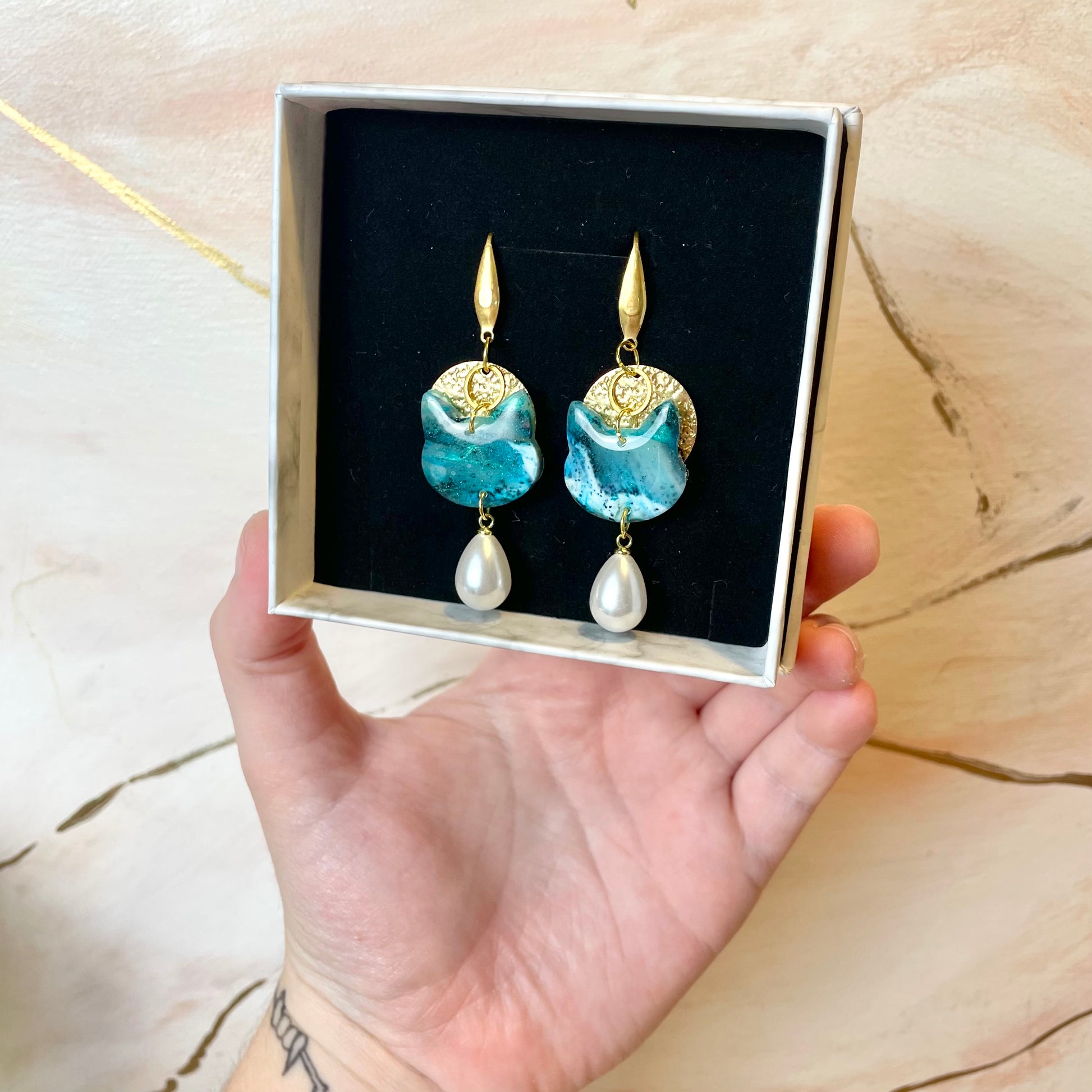 Boucles d’oreilles chat pendantes bleu vert dorées