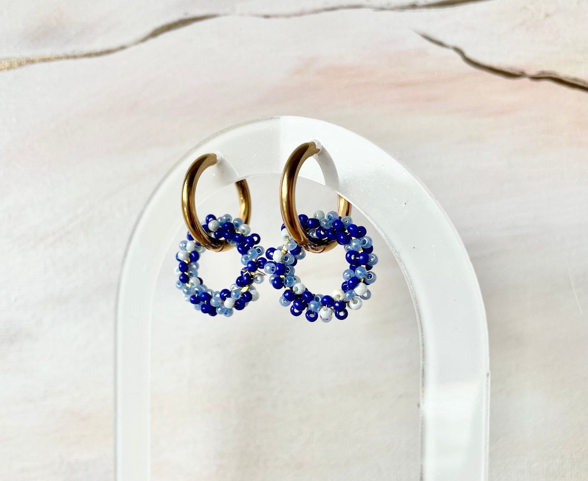 Boucles d'oreilles artisanales, réalisées à partir de perles acryliques tressées en cercle.