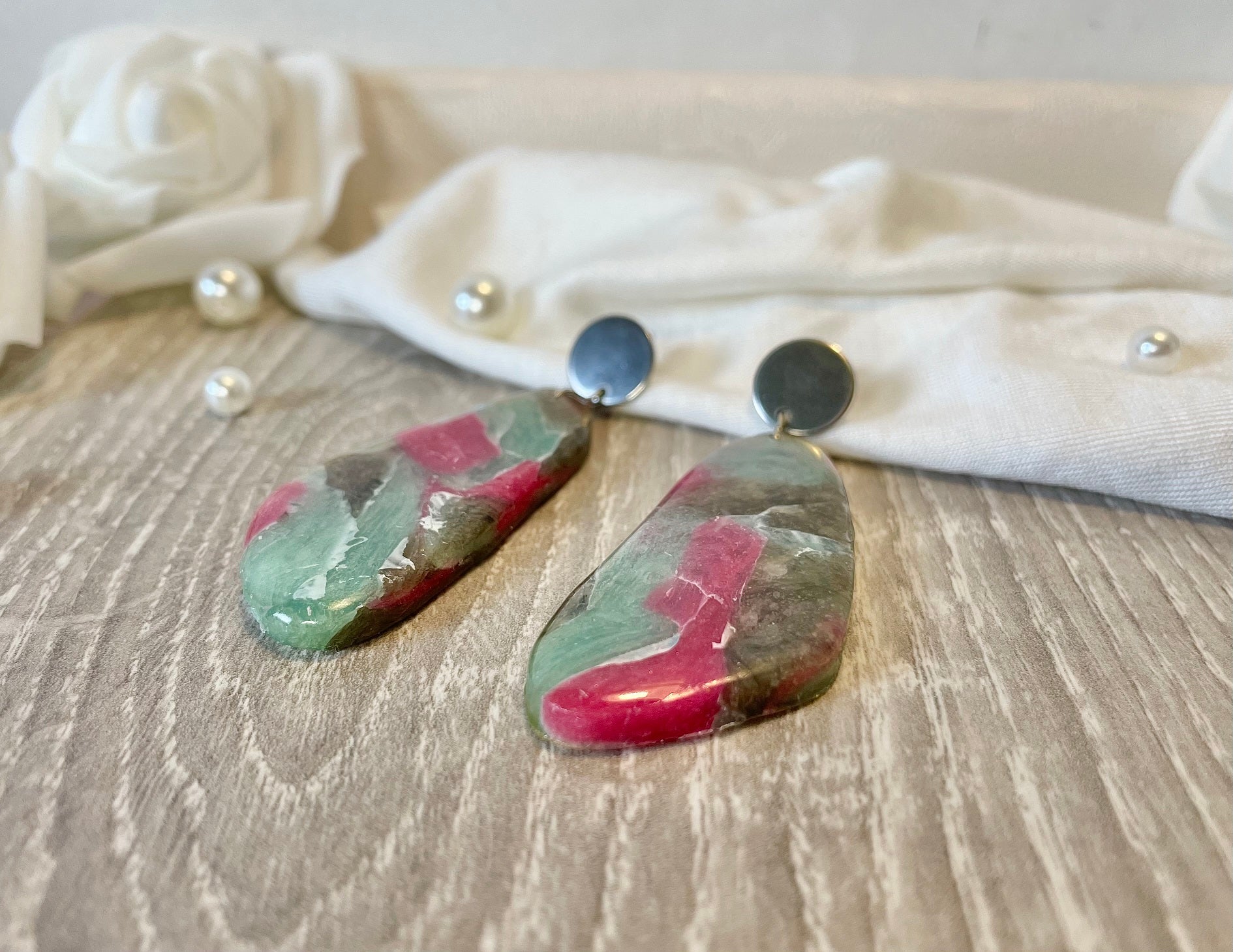 Les boucles d'oreilles sont montées sur une monture en acier inoxydable, hypoallergénique et accompagnées d'un petit fermoir.
