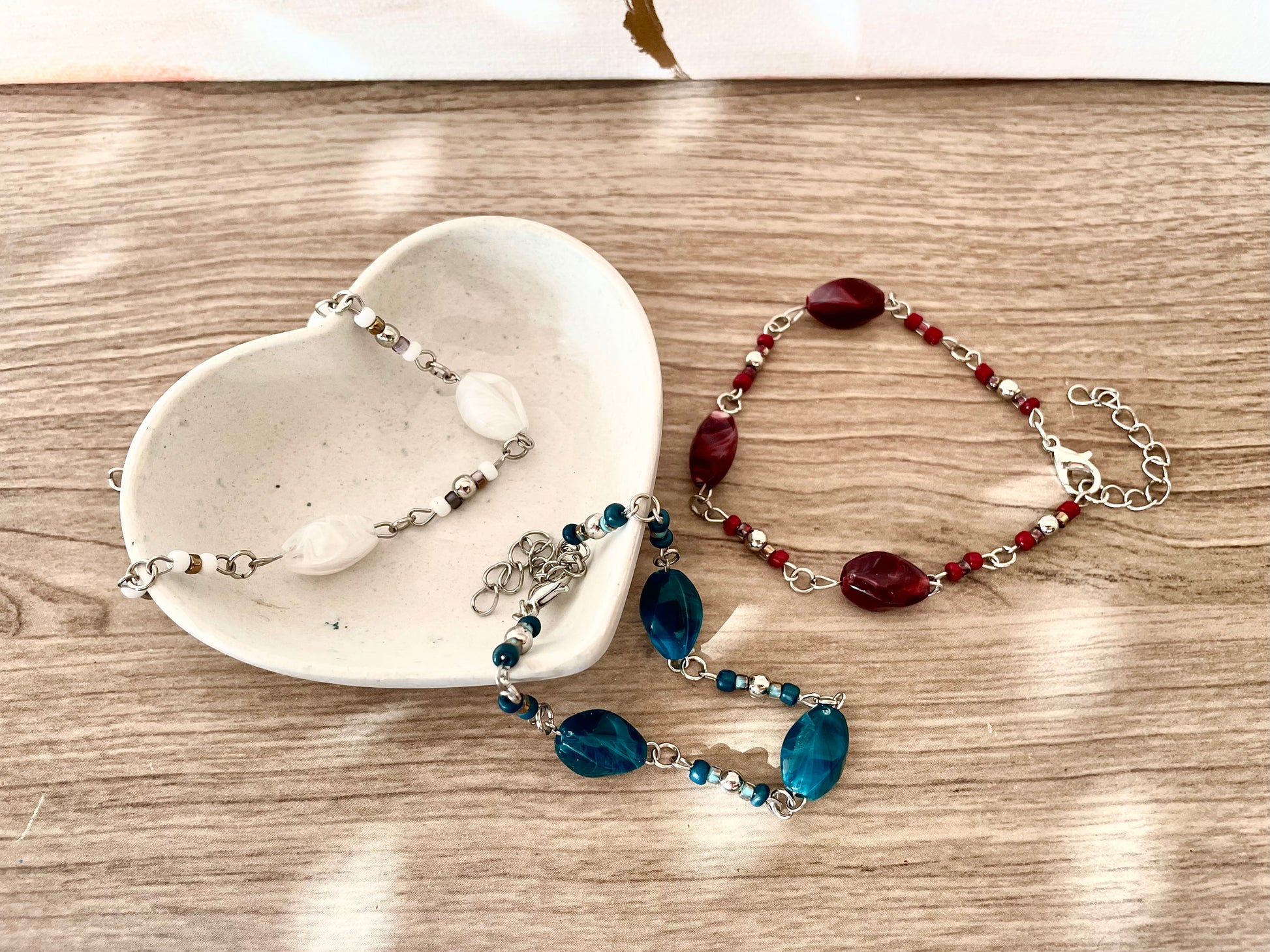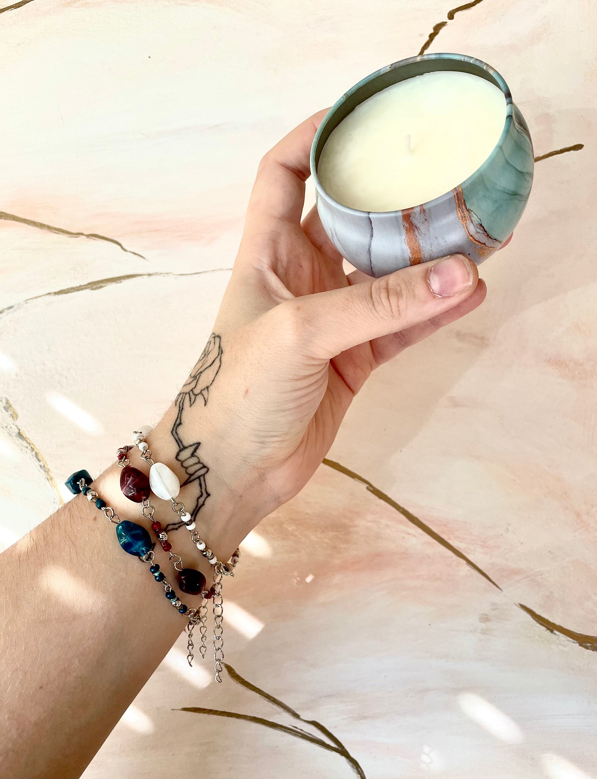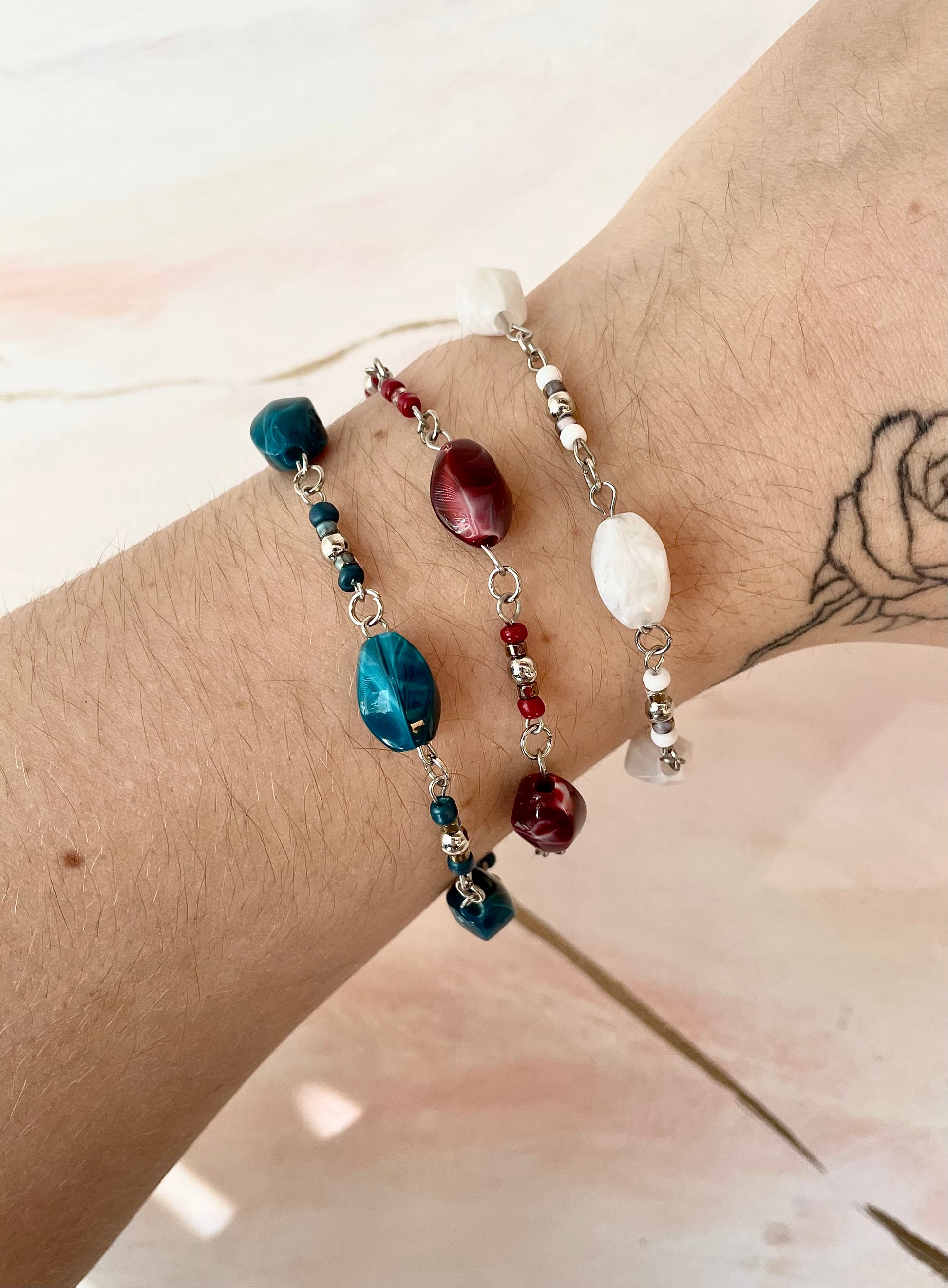 Un bracelet en acier inoxydable est caché dans la bougie ! Fait main, il est assemblé dans notre atelier avec une longueur standard de 16 cm et un fermoir avec une chaine de taille réglable. Tu auras le plaisir de découvrir aléatoirement un bijou aux perles bordeaux, bleues ou blanches ~
