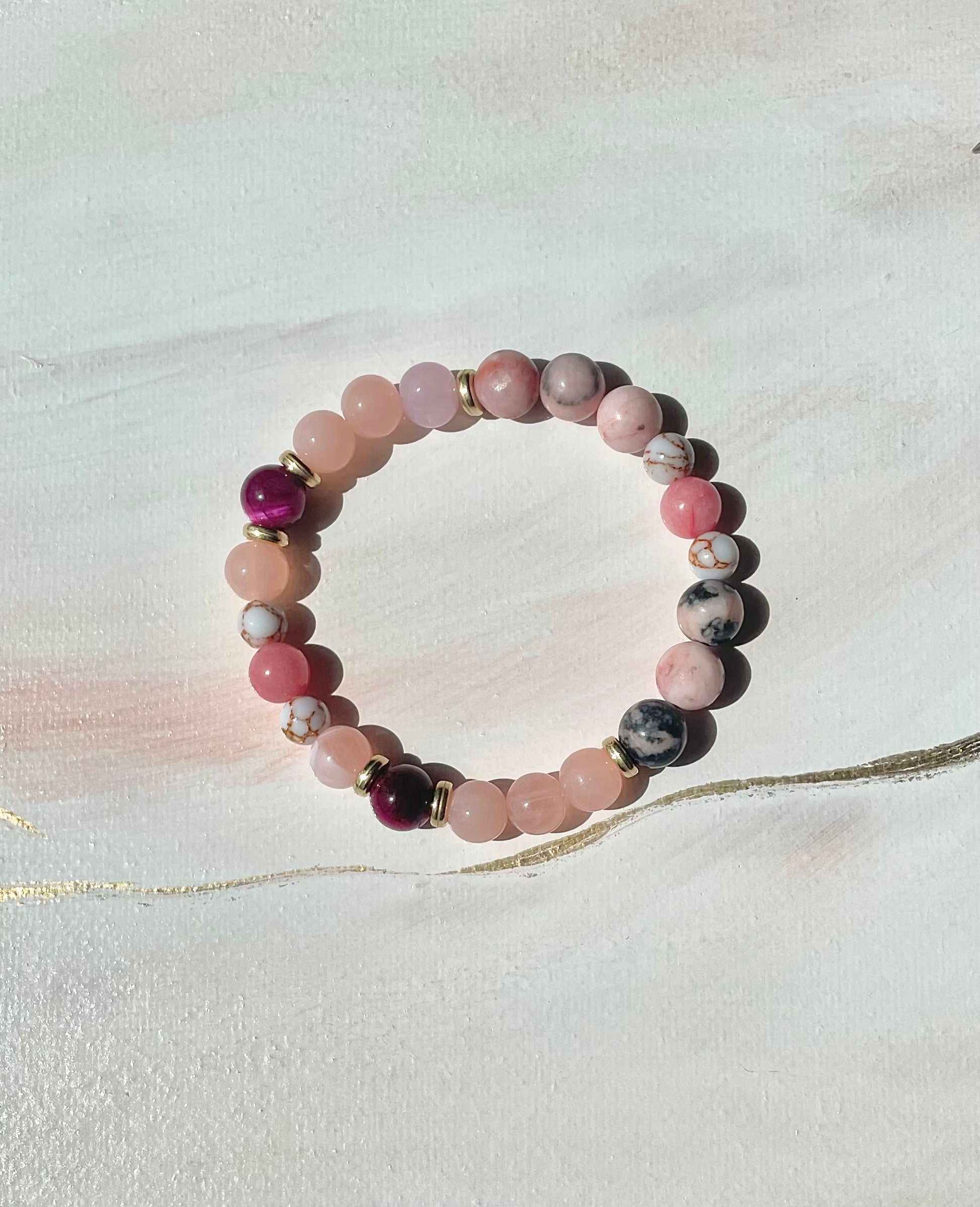 Le bracelet combine des pierres de quartz rose apportant l'amour et la confiance en soi, des pierres de rhodonite atténuant la rancœur et la colère des howlites blanches permettant de réduire le stress et diminuer les problèmes de digestion, et des pierres d'œil du tigre rouge qui permet d'exprimer et purifier toutes ces énergies.